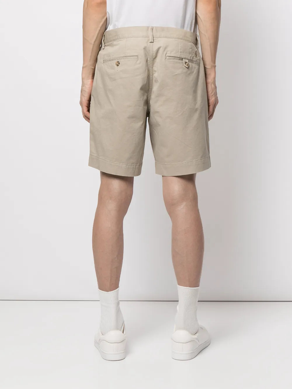 mistura de algodão bege fecho de botão presilhas de cinto dois bolsos laterais com fenda dois bolsos traseiros de debrum