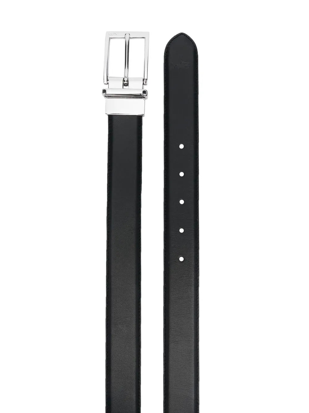 couro de bezerro preto com logotipo gravado em tom de prata, fecho com fivela, furos pré-perfurados, ajuste ajustável, carimbo interno do logotipo, ferragens em tom de prata