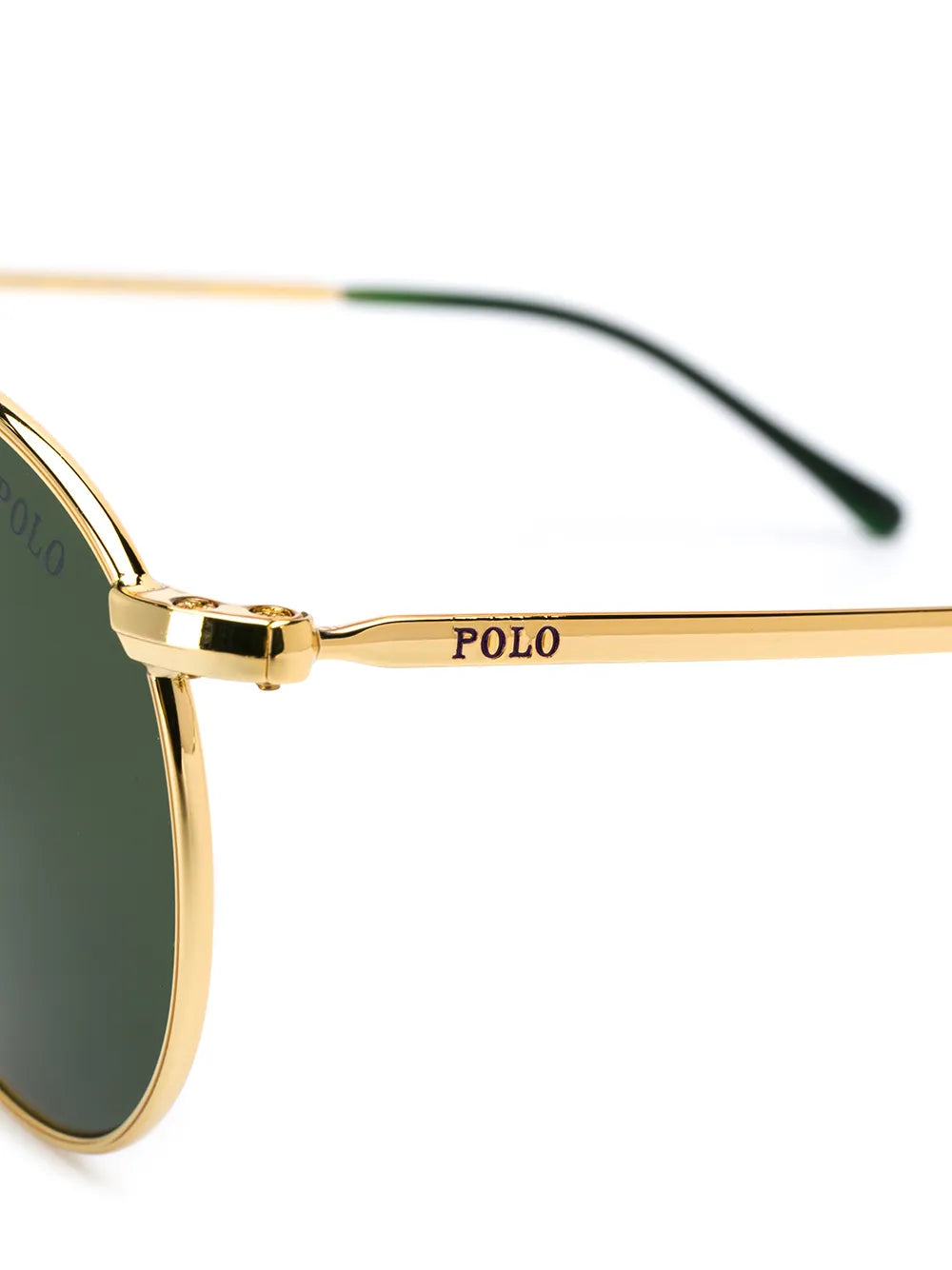 Óculos de sol aviador dourados da Polo Ralph Lauren, com armação estilo aviador, ponte dupla, lentes coloridas, decalque da logomarca na lente, logo na haste e hastes retas com pontas curvas. Este item vem com um estojo protetor.
