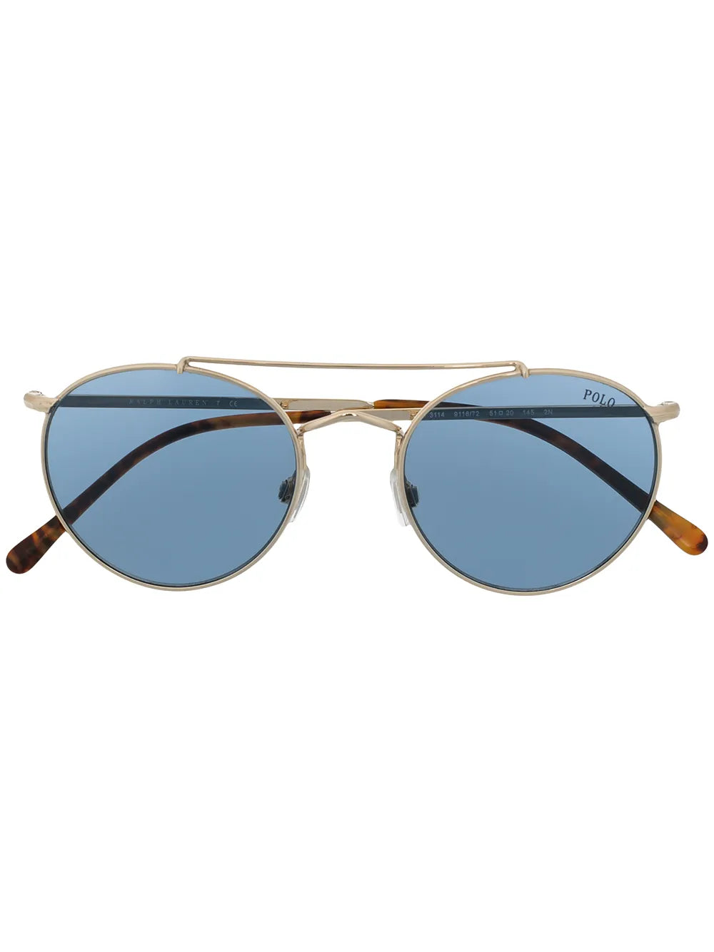 lentes metálicas douradas com tonalidade azul, ponte dupla, ponte nasal, hastes retas, armação piloto. Sabemos que você vai cuidar deles, mas esses óculos vêm com proteção, para qualquer eventualidade.